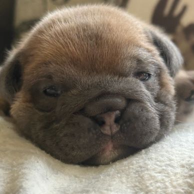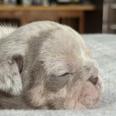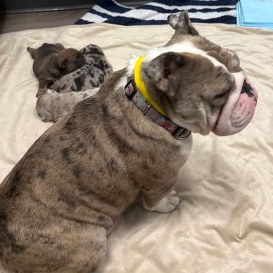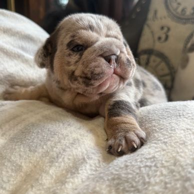 we absolutely love this little gem. Bailys has stolen my heart. She is growing fast and changing daily. She is a beautiful Tri chocolate Merle female. She is so sweet and loves cuddling and curling up on your chest.