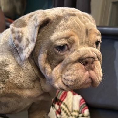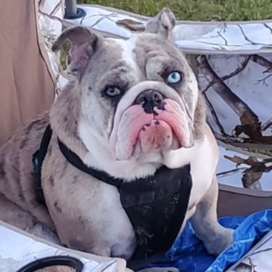 Maddie AKC and UKC registered. What a beautiful addition to our breeding program. She is a beautiful Piebald Lilac Merle. Maddie has the calmest and kindest temperament. She fits in so well. She is health checked and we wait for her production. So excited to see her March 2026 litter